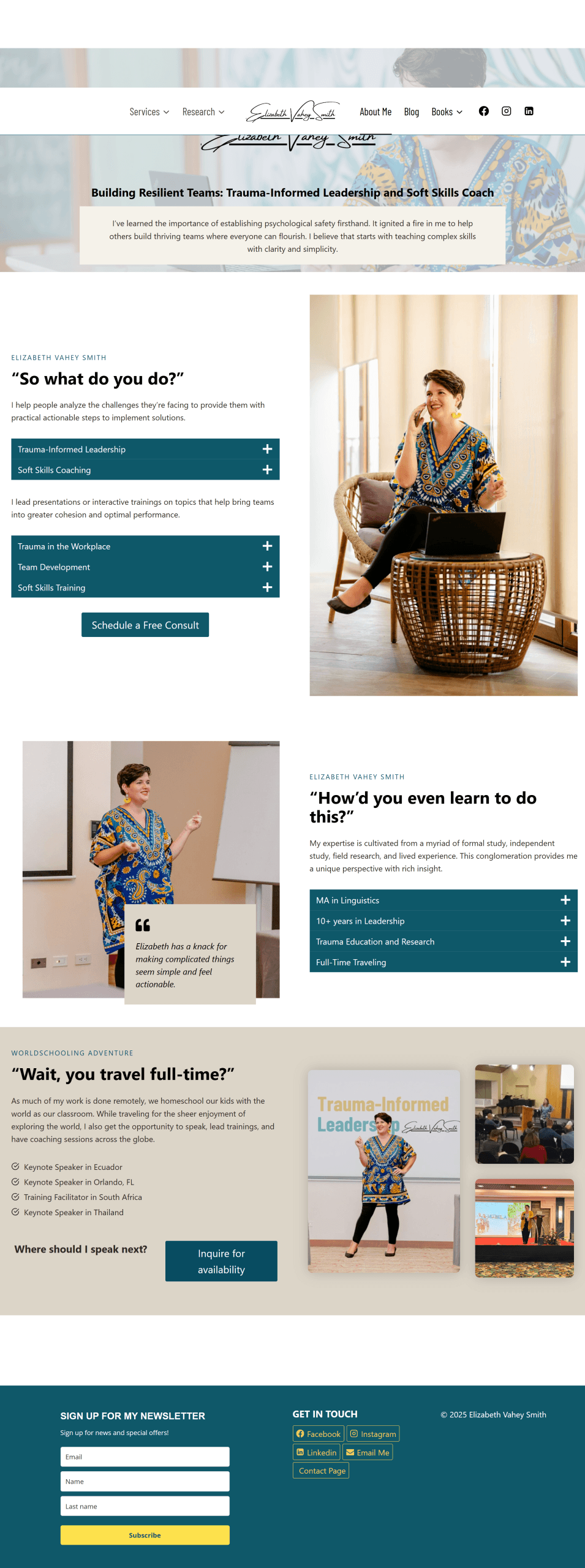 Elizabeth Vahey Smith is a researcher, public speaker, and a leadership coach focusing on Trauma-informed Leadership skills. I designed this website from scratch using WordPress.